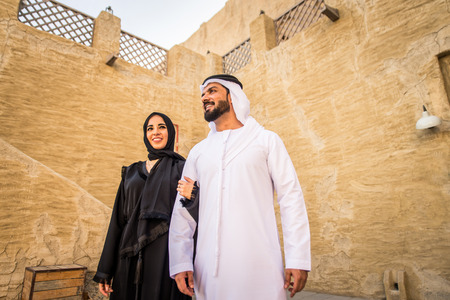 Arabian couple with traditional emirates dress dating outdoors - Happy middle-eastern couple having fun