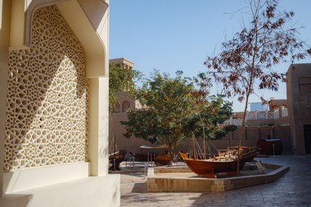 Dubai, UAE 17 February 2020: Old Dubai buildings and Arabian street. Historical Al Fahidi neighborhood, Al Bastakiya. beautiful wooden old ship in yard