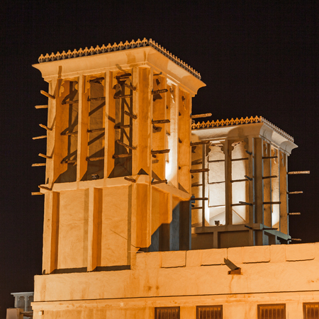 Traditional wind towers photographed at night at the Dubai Heritage Village in the UAE. The towers catch the cooler breezes that prevail above the ground and directs them into the interior of the buildings.