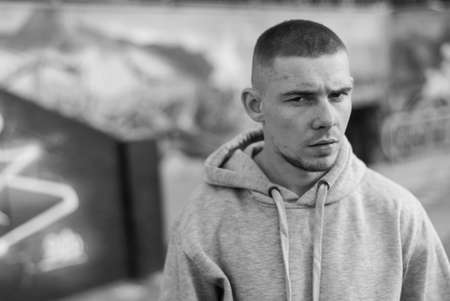 A bully guy in a light sports jacket with a hood. Black and white photo. BW