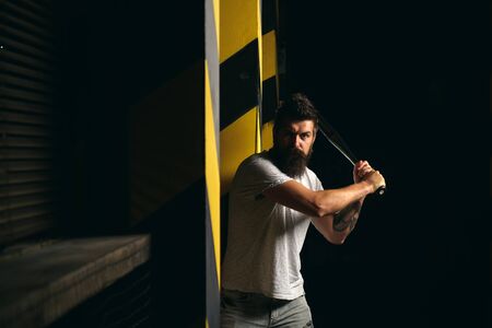 Aggression or anger and violence concept. Attack concept. Man unshaven face hold baseball bat. energy and fashion. Strong temper. Bearded man hold baseball bat. Ready to swing.