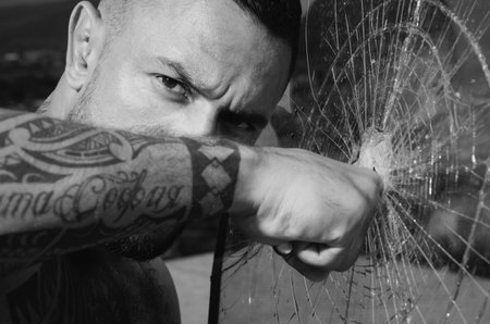 Destroy obstacles. Man muscular body punching. Handsome brutal man near broken glass. Brutal handsome macho focused on fight result. Concentrated on target. Want to fight right now. Fight concept