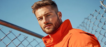 Portrait Of Serious Young Man In Orange Jumpsuit Standing Outdoors Between Chain Link Fences