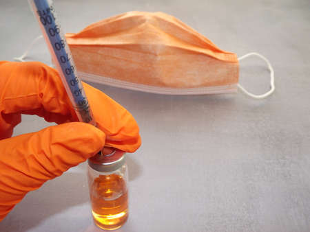 a womans hand in an orange glove holds a vaccine on a gray background. High quality photo