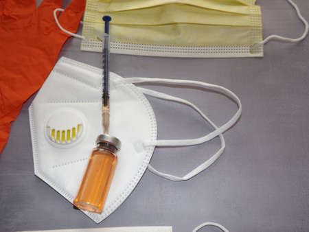 on a gray background, a vaccine, a syringe, orange medical masks and gloves. High quality photo