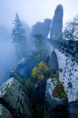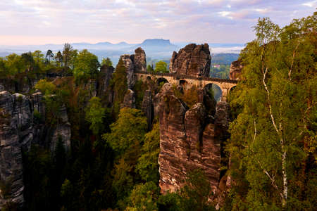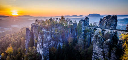 Picturesque autumn landscape in Saxon Switzerland National Park and Bastei bridge. Location: Lohmen, state of Saxony, Germany, Europe