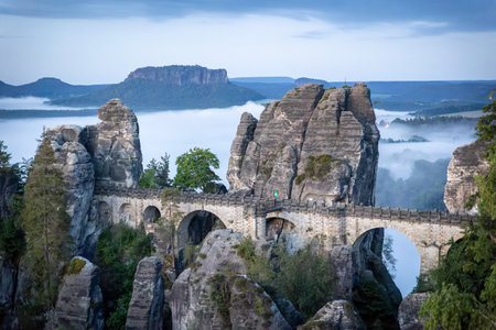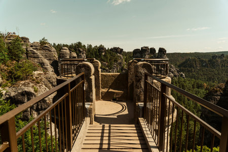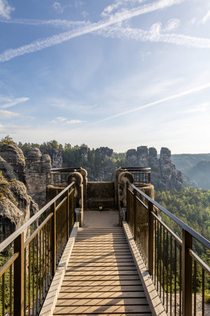 Famous Bastion Bridge in the Saxonian Swiss in Germany, shot on a warm summer morning after sunrise. Amazing Landmark of Saxonia. Impressive Sandstone Rock Formations. Bridge leading to a former medieval castle near Dresden