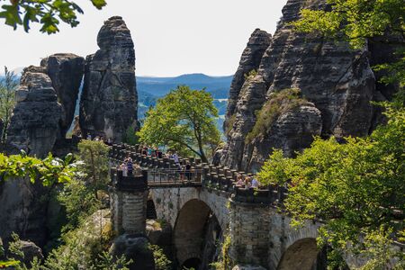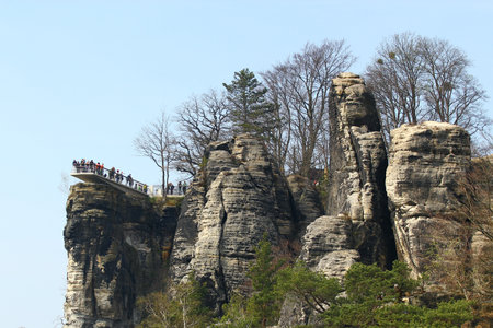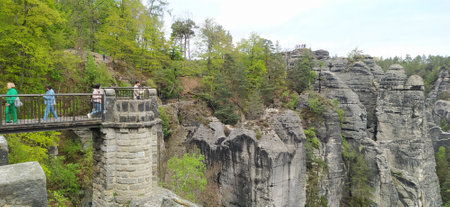 Saxon Switzerland National Park, Germany - April 19, 2124: The people going at Bastei bridge at Saxon Switzerland National Park