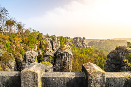 Saxon Switzerland National Park, Germany, 6 November 2021: Bastion Bastei Bridge, Rock Formations in Elbe River Valley, Sandstone Mountains Path, autumn forest landscape at sunny day, rocky valley