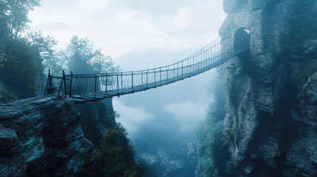 A suspension bridge stretching across a foggy mountain gorge, shrouded in mystery and soft light.