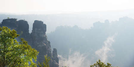 Bastei, Germany: Beautiful landscape with bastey rocks in the national Park Saxon Switzerland, Kurort Rathen, Dresden. Fog in the mountains