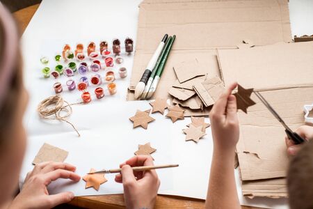A child carves a star from cardboard. Christmas decoration, Christmas garland, hand made and Zero waste. Hands of a child on a white background. Div.