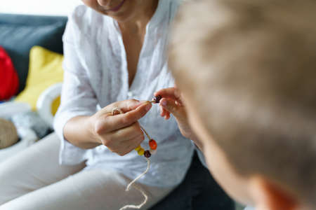 top view on midsection of unknown female holding string with wooden or plastic pearls making nature materials bracelet necklace at home - Creative designer working Creativity hobby and leisure concept