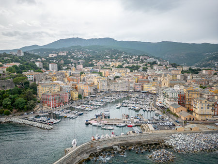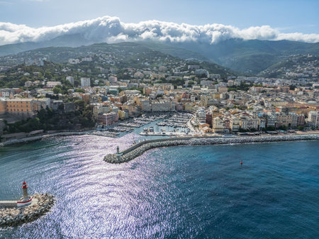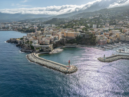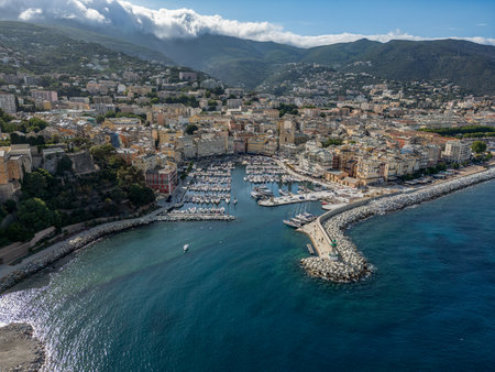 Beautiful panorama of city of Bastia in Corsica. Aerial skyline view of the capital of the island Corsica.