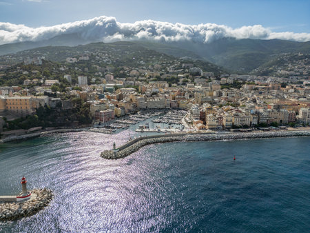 Aerial view Mountain Viewpoint of Bastia in the north of Corsica island - Genoese city overlooking the Mediterranean Sea