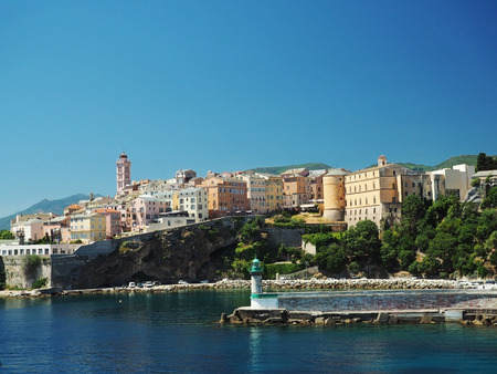 FRANCE, CORSE, BASTIA, JUNE 23, 2017: port view from sea on harbour with green lighthous church and old town blue sky background