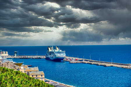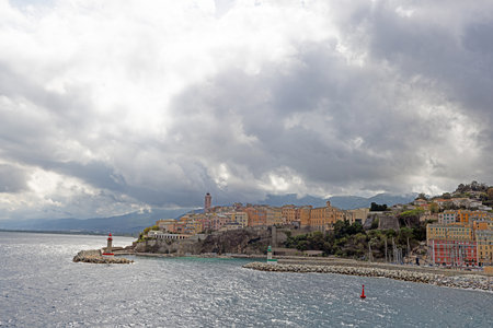 Panoramic view of Bastia Corsica from the sea with colorful buildings under dramatic cloudy skies in summer