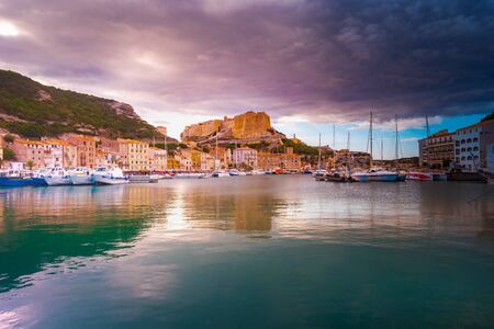 Image of Bonifacio port and Citadel in South of Corsica. Harbour and Limestone cliffs with Fortress on the very top. Breathtaking views of the French island.