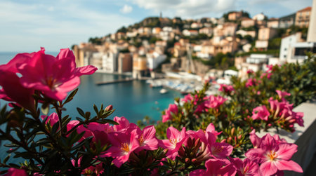 Vibrant pink flowers in full bloom overlooking a picturesque coastal town and harbor. A perfect summer getaway scene.