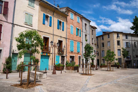 Ganges, France - 6.6.2021.Colored house facades with public space in the foreground and blue sky in the background.