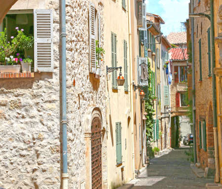 Traditional old stone houses on a street in the medieval town of Saint Paul de Vence, French Riviera, South of France