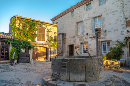 The vintage stone mansion with wooden shutters on windows and twisted grape vines and roses, climbing up the wall, Tarascon, France