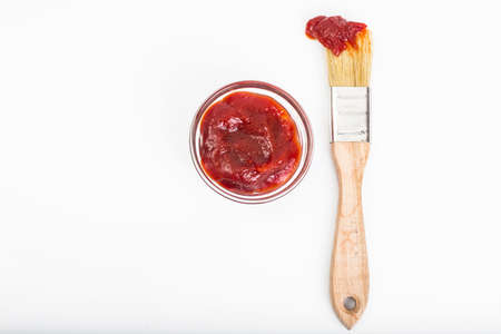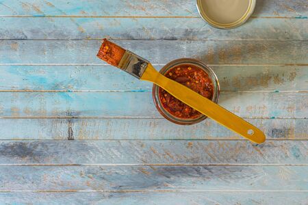 Traditional Moroccan healthy spicy harissa, vegetarian appetizer or dip with roasted red peppers, flat lay or top view on wooden background. Homemade Tunisia and Arabic cuisine adjika with copy space