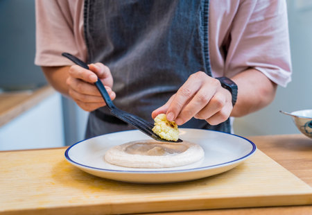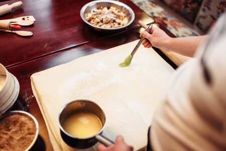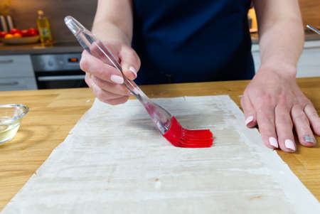 A woman lubricates parchment with sunflower oil. For making puff pastry curls with poppy and walnut filling.