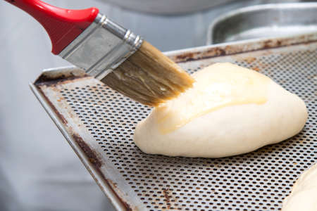 A close-up of hands of a pastry chef gently brushing egg yolk over uncooked bread dough with a silicone brush.
