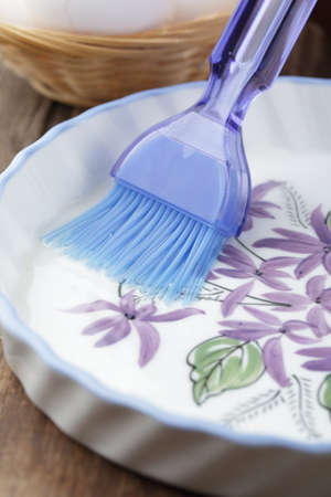 A closeup shot of a container of melted butter and a food brush on a kitchen table