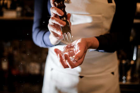 Professional female bartender in the white apron breaking a piece of ice for a fresh delicious cocktail at the bar counter