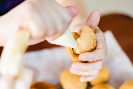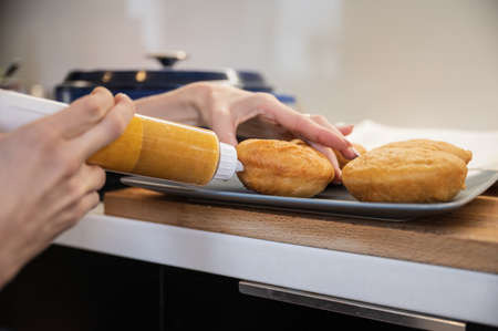 Closeup view of a woman filling homemade fried vegan doughnuts with apricot jam.