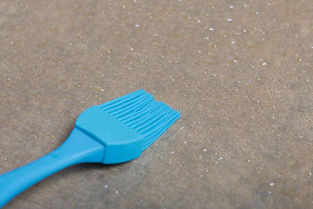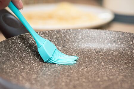 Woman lubricates the frying pan surface with sunflower oil by a kitchen brush close up background.