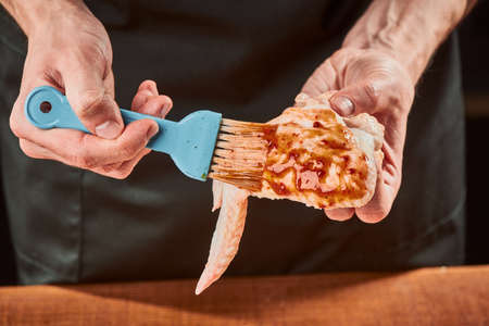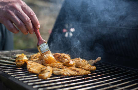 Man marinating chicken breast on the BBQ grill by a mix of spice, grilling concept