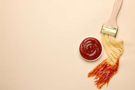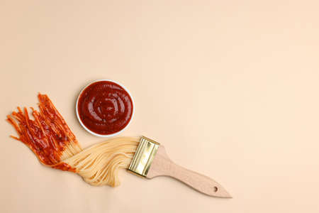 Brush painting with spaghetti dipped in ketchup on beige background, flat lay. Space for text. creative concept