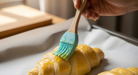 A close-up shot of a baker's hand using a turquoise silicone pastry brush to apply a golden egg wash onto a raw, unbaked croissant. The croissant is resting on white parchment paper on a baking sheet, preparing it for the oven. This image represents baking, patisserie, and food preparation.