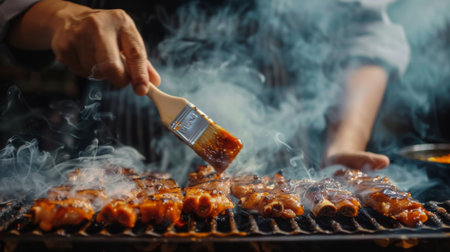 A chef brushing marinade onto pork neck slices on a grill, with smoke billowing and aromas filling the air
