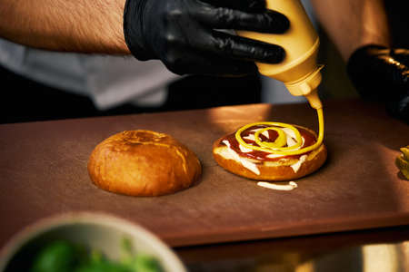 Close up view of hamburger, preparing with ketchup and mayo sauce on cutting board. Crop view of chefs hands in gloves, pouring mustard on grilled buns, making cheeseburger. Concept of fast food.
