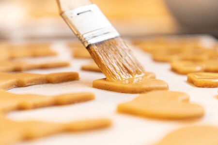 Woman holding wooden brush dipped into the egg whisked egg white and egg yolk in a small glass bowl during preparation of pastry