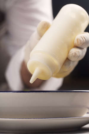 Professional cook adding condiments on burger sandwich. Hands in gloves adding creamy sauce on a sliced bun.