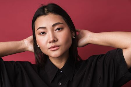 Close up of a pretty confident young asian woman wearing casual clothes standing isolated over red background, looking at camera