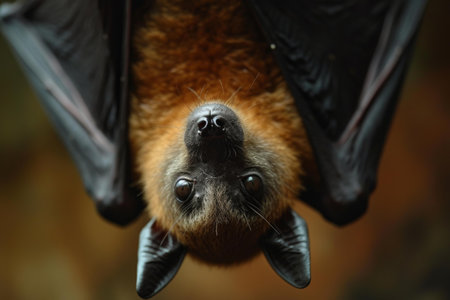 A large bat hanging upside down, displaying its striking presence. Concept Wildlife Photography, Nocturnal Creatures, Bat Behavior