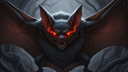 Scary bat is flying in a dark forest with its wings spread and glowing red eyes