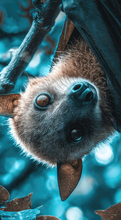 A close-up view depicts a fruit bat suspended upside down from a tree branch. Its fur appears in shades of brown and beige, complemented by large, dark eyes. The composition utilizes a shallow depth of field, with the background displaying a teal color suggesting an outdoor setting. This image may be suitable for nature-themed projects.