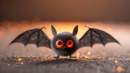 A charming 3D illustration of an adorable bat with big, glowing red eyes, set against a warm, festive background.