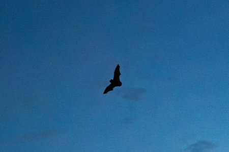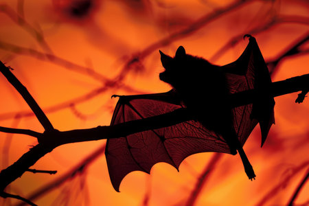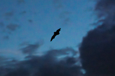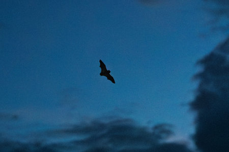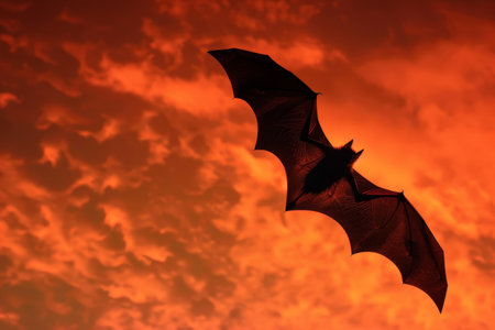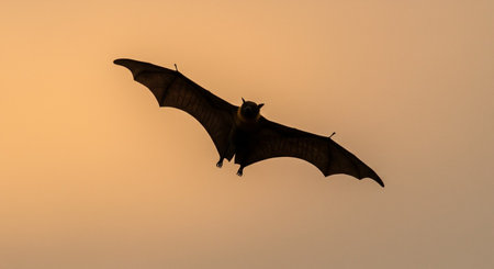 Silhouette of flying bat against dramatic sunset sky in serene nature scene