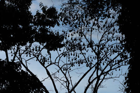 A silhouetted image of flying foxes aka fruit bats roosting in a tree against a blue and cloudy evening sky