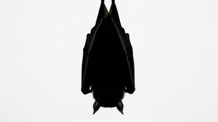 A black silhouette of a bat hangs upside down with wings folded against a bright white background.