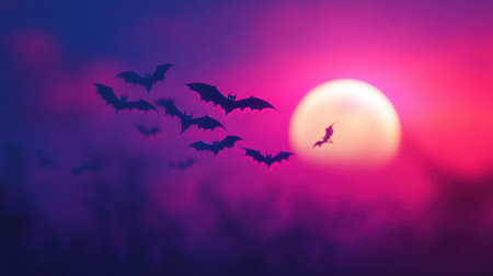 A captivating scene featuring bats flying across a stunning sunset, blending vibrant pink and purple hues in the sky. Ideal for Halloween and spooky-themed projects.