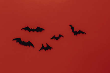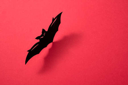Handcraft paper bat on a red background with shadow and copy space for text. Layout to Halloween. Flat lay